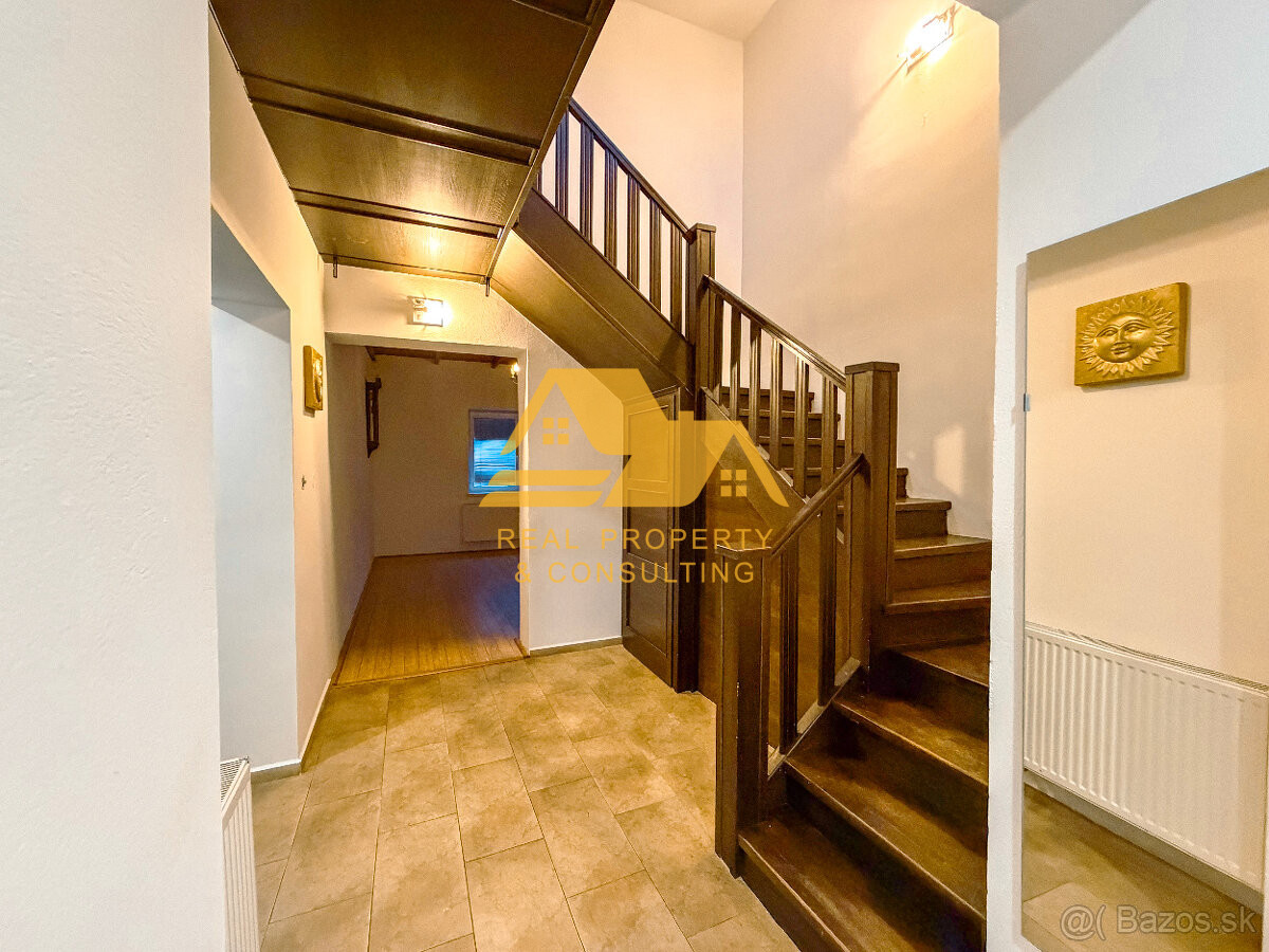 DISPOZÍCIA A VYBAVENIE: Dom je dobre dispozične riešený. Na prízemí sa nachádza kuchyňa s kuchynskou linkou so spotrebičmi a špajzou s výstupom na zastrešenú terasu, veľká obývačka s krbom spojená s jedálňou, obytná izba, kúpeľňa so sprchovým kútom, oddelená toaleta, technická miestnosť, garáž prepojená s domom. Poschodie disponuje 3 veľkými obytnými izbami, 1 priechodnou miestnosťou, kúpeľňou so sprchovým kútom a toaletou, zastrešenou terasou. V suteréne sa nachádza pivnica. ODPORÚČAM OBHLIADKU!